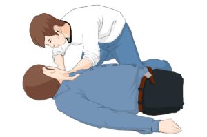 如果患者一開始就已經沒有脈搏,或者人工呼吸進行一分鐘后還是沒有觸及,則需進行胸外心臟按壓。施救者先要找到按壓的部位。沿著最下緣的兩側肋骨從下往身體中間摸到交接點,叫劍突,以劍突為點向上在胸骨上定出兩橫指的位置,也就是胸骨的中下三分之一交界線處,這里就是實施點。施救者以一手疊放于另一手手背,十指交叉,將掌根部置于剛才找到的位置,依靠上半身的力量垂直向下壓,胸骨的下陷距離約為4~5厘米,雙手臂必須伸直,不能彎曲,壓下后迅速抬起,頻率控制在每分鐘80~100次。